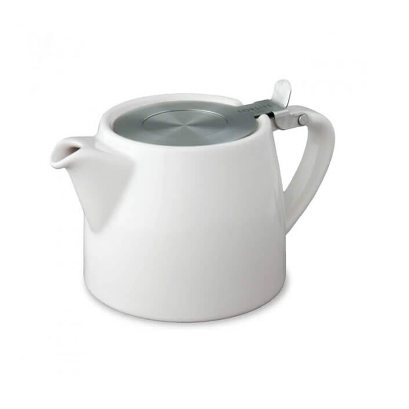 This stump-shaped porcelain teapot with reinforced walls features a brew basket, making it suitable for both loose leaf tea and teabags.